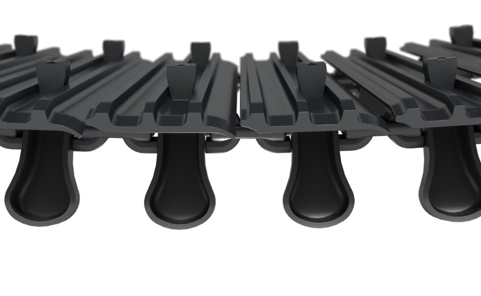 Flotec minimerar marktrycket eftersom tyngden fördelas jämnt över de raka bandplattorna. Detta ger maximal bärighet samt minimerade markskador.